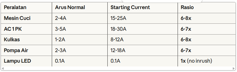 Pattern: Semua peralatan dengan motor listrik punya starting current 6-8x arus normal!